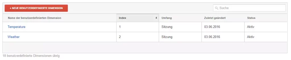 Mit einem Google Analytics Event Tag senden wir dann die entsprechenden Daten in Google Analytics. Damit wir diese in allen Reports verwenden können haben wir zusätzlich zwei benutzerdefinierte Dimensionen erstellt, in der Dimension „Weather“ wird abgebildet wie die Wetterbedingungen sind und die Dimension Temperature zeigt uns wie warm bzw. kalt es da ist, wo sich der Webseitenbesucher gerade aufhält.