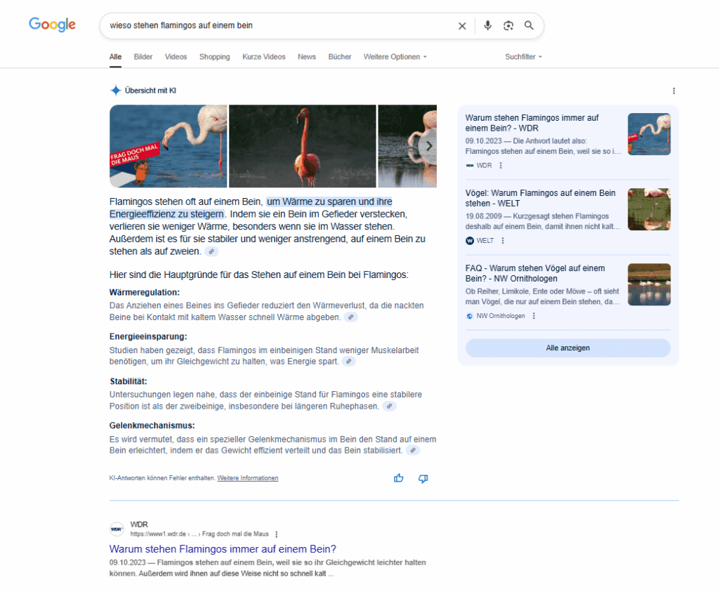 Auf dem folgenden Screenshot ist ein AI-Overview zu sehen auf google.ch, allerdings noch ohne Anzeigen: