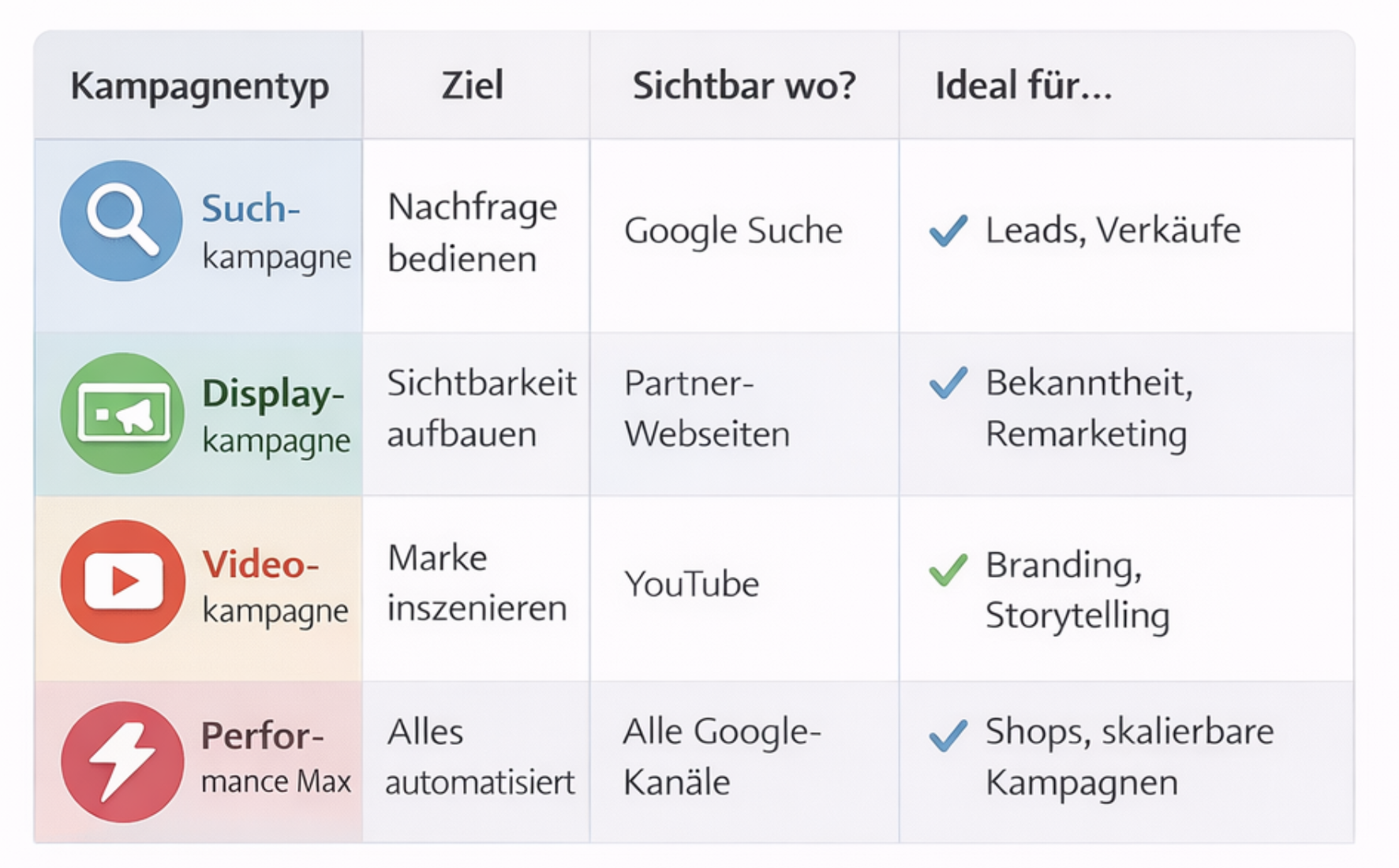 Google Ads bietet dir nicht nur eine, sondern mehrere Arten von Kampagnen – je nachdem, wen du erreichen willst und in welcher Situation.