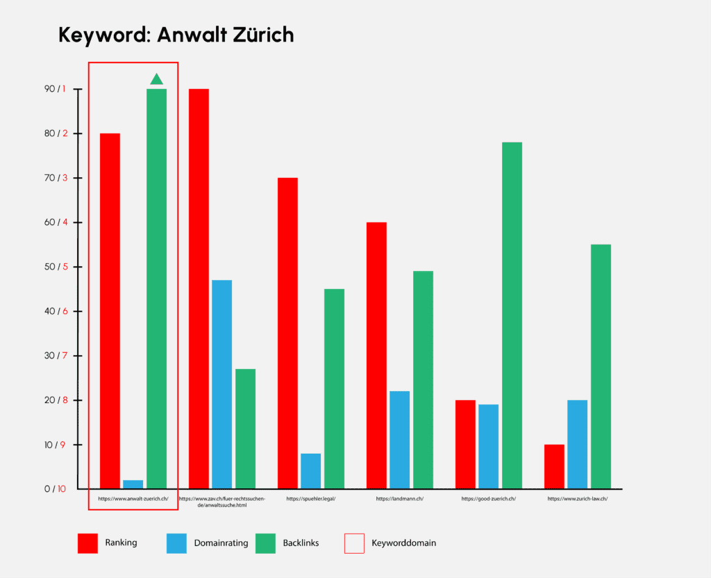Beim Keyword «Anwalt Zürich» schafft es die Keyword Domain auf platz Zwei. Das Domainrating ist relativ niedrig trotz der grossen Anzahl an Backlinks. Aber ein top Position ist der Keyword Domain sicher.