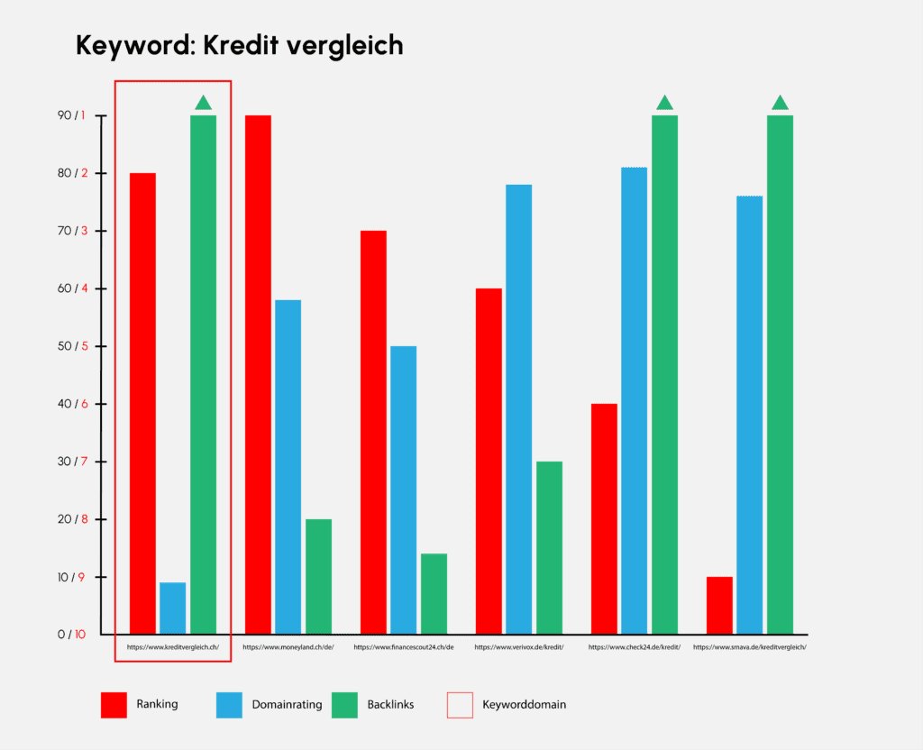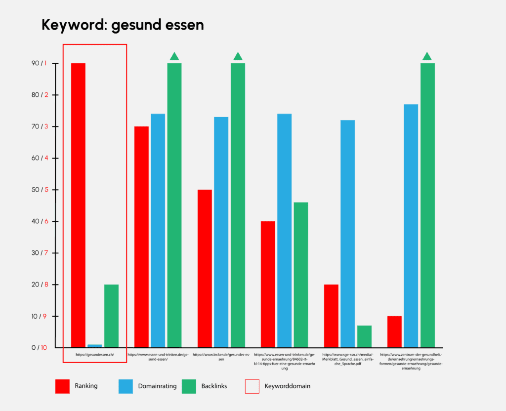 Beim Keyword «gesund essen» sind wir uns wahrscheinlich einig. Die Keyworddomain schlägt alle, trotz eher schwacher Backlinkstruktur und Domain-Autorität. Hier wird meiner Meinung nach eine Keyworddomain klar bevorzugt.