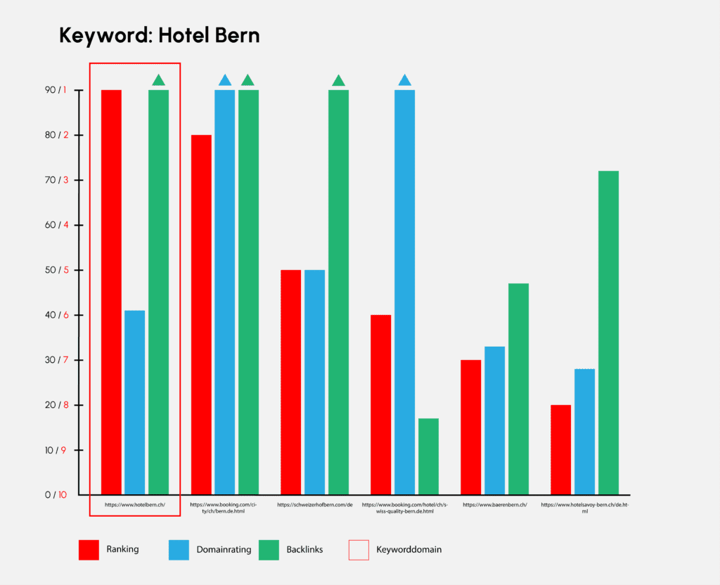 Auch beim Keyword «Hotel Bern» gewinnt die Keyworddomain. Die Domain-Autorität ist stark und auch die Backlinkstruktur ist stimmig. Hier muss es nicht zwingend die Keyworddomain sein, welche der ausschlaggebende Grund ist für Platz eins. Booking.com ist auf dem zweiten Platz.