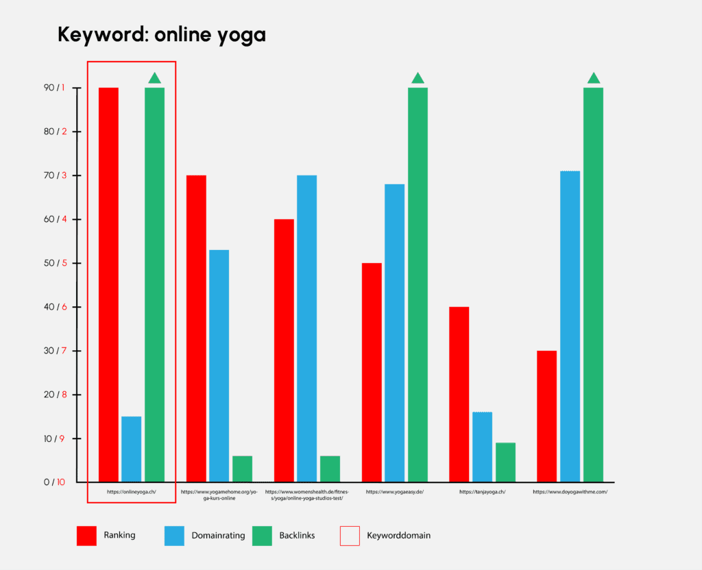 Ein ähnliches Bild zeigt sich beim Keyword «Online Yoga». Trotz schlechterer Domain-Autorität gewinnt die Keyworddomain gegenüber anderen Domains.