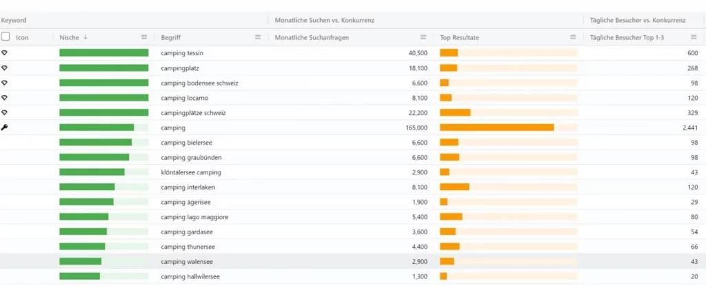 Das Keyword „Camping“ hat hier (was zu erwarten war) das höchste Traffic-Potenzial, jedoch sehen wir am orangen Balken dass wir hier auf eine grosse Konkurrenz stossen werden wenn wir ranken wollen. Wenn wir mit dem Keyword „Camping“ unter den Top 3 ranken würden könnten wir mit einem täglichen Traffic von ~2400 rechnen. Dies ist meistens etwas defensiv berechnet. Würde es sich in dem Fall lohnen für das Keyword „Camping“ Inhalte zu erstellen, damit man mit diesem rankt? Wenn Du eine Autorität im Netz bist kannst Du dies könnte es eine SEO Strategie sein. Du musst folgende Konkurrenten ausstechen: