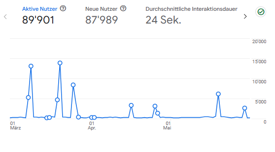 89’901 aktive Nutzer, aber nur 24 Sekunden durchschnittliche Interaktionsdauer. Die Spikes (bis 20’000 Nutzer an einzelnen Tagen) haben keine erklärbare Ursache – keine Kampagne, keine Medienpräsenz, nichts.